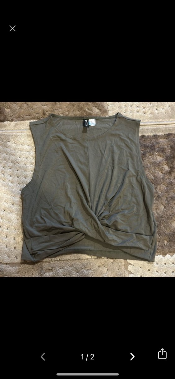 Gri renkte, keten kumaştan, salaş kesim, yuvarlak yaka ve drapeli ön detaya sahip kolsuz atlet.