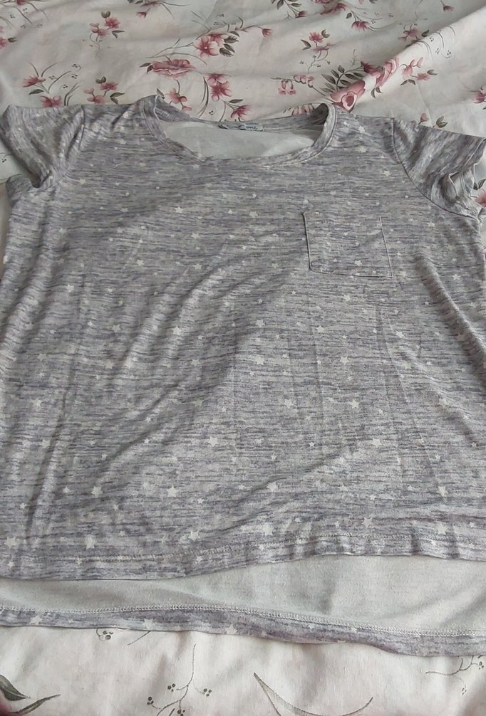 Gri keten kumaştan kısa kollu, yuvarlak yakalı, salaş kesim hamile tişörtü. Küçük cepli, günlük kullanıma uygun rahat bir model.