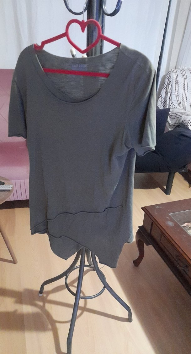 Gri keten kumaştan, salaş kesim ve yuvarlak yakalı hamile tişörtü. Kısa kollu ve normal midi boyda, drapeli detaylara sahip günlük kullanım için uygundur.