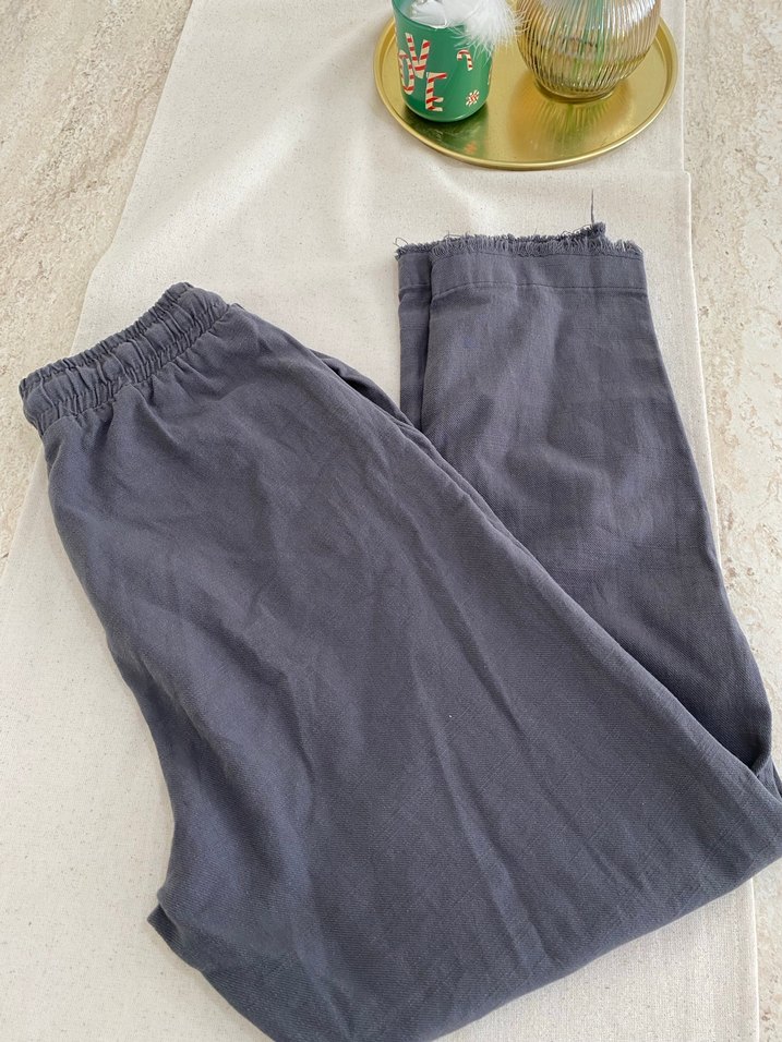 Gri keten kumaştan, , ve lastikli bel detayına sahip kadın pantolon. Günlük kullanıma uygun, rahat ve şık bir parça.
