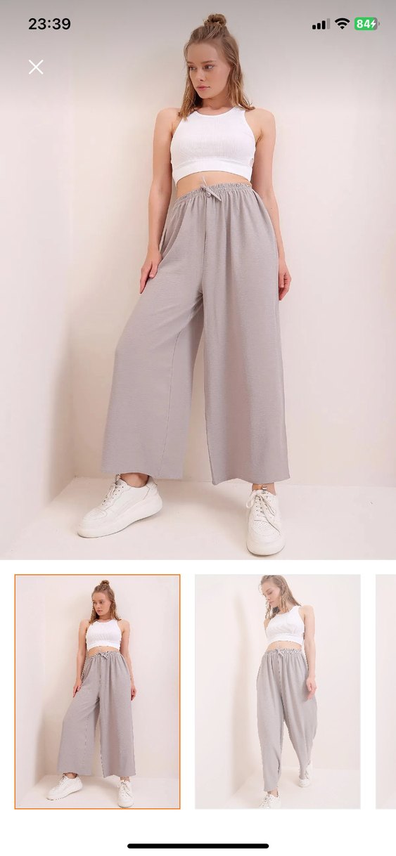 Yumuşak keten kumaştan, gri tonlarında salaş kesim kadın midi pantolon. Günlük kullanıma uygun, zahmetsiz şıklık sunar.