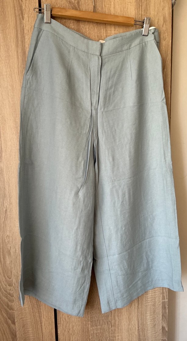 Gri keten, salaş kesim, midi boy, desensiz kadın pantolon, günlük kullanıma uygun rahat şıklık sunar.