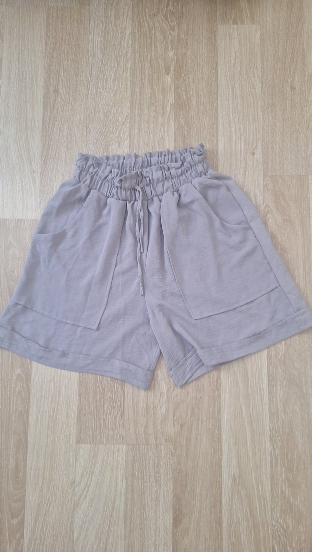 Gri keten hamile şortu, salaş kesimi, lastikli beli ve cepleriyle günlük rahatlık ve zahmetsiz şıklık sunar.