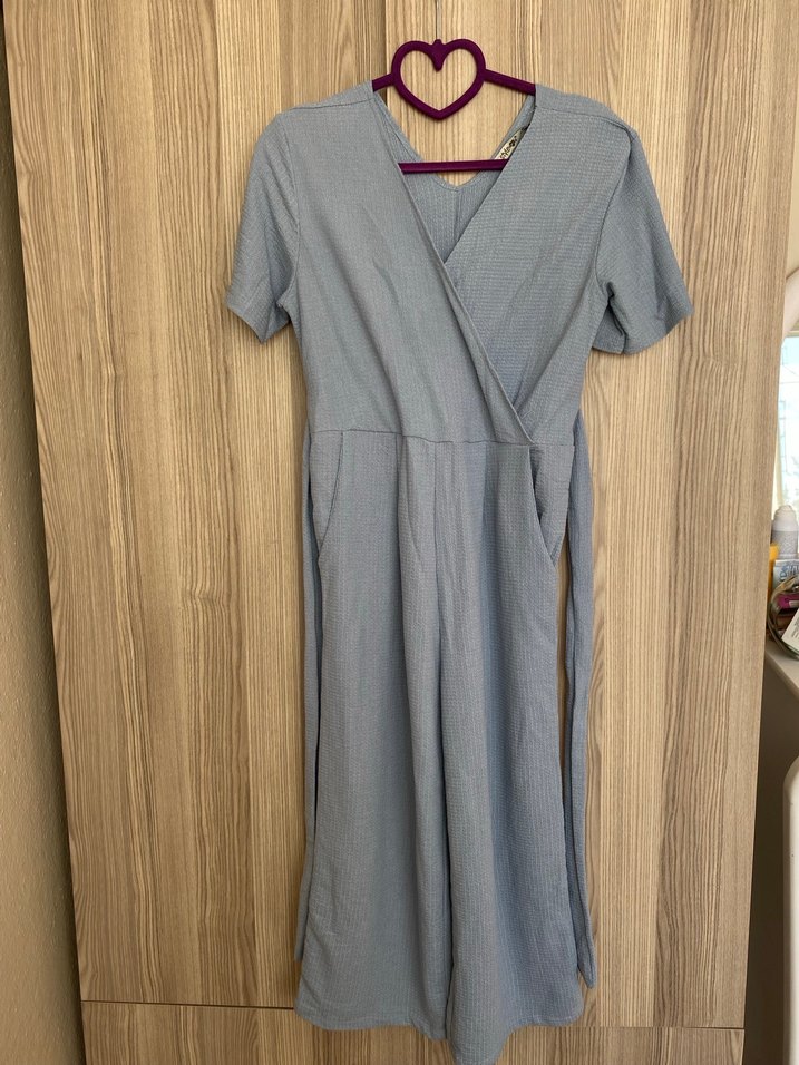 Gri keten tulum, salaş kesim ve drapeli detaylara sahip. V yaka, kısa kollu ve uzun boylu, günlük rahat kullanım için uygundur.