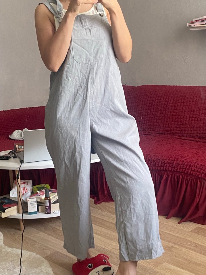 Gri keten tulum, straplez yakalı ve askılı, rahat kesimiyle günlük kullanıma uygun şık bir model.