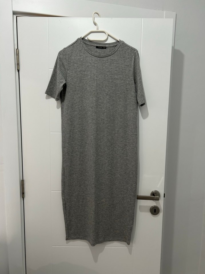 Gri renkte, kısa kollu ve bisiklet yaka uzun yumuşak kumaştan yapılmış, dar kesim basic elbisedir. Minimalist normcore tarzıyla günlük kullanıma uygundur. L beden olarak kullandım . Bir kere giydim .