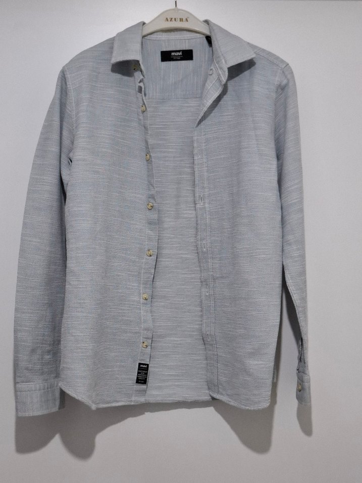 Gri keten kumaştan, düğmeli ve uzun kollu erkek gömleği. Normal kesim ve notched yakalı, günlük rahat kullanım için uygun.