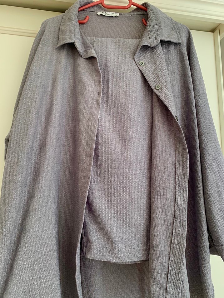 Gri keten kumaştan, uzun kollu, düğmeli ve geniş kesime sahip kadın gömleği. Defosu yoktur