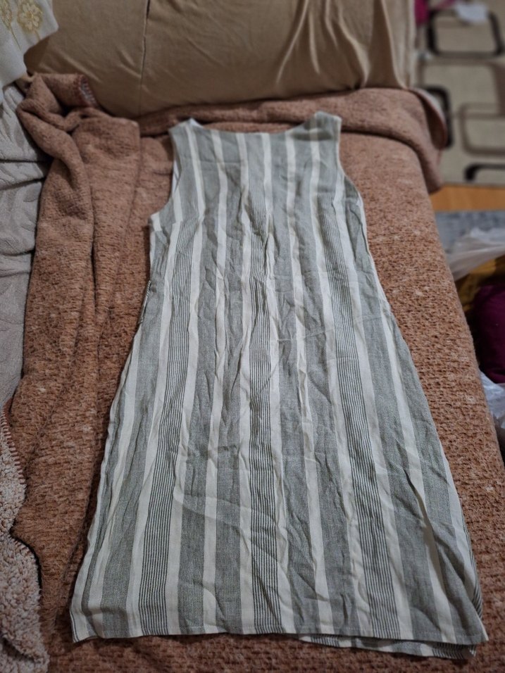 Gri renkte, keten kumaştan yapılmış, uzun boy ve kolsuz, tek renk bohem tarzda elbise. Kayık yaka ve salaş kesimiyle günlük kullanıma uygundur.