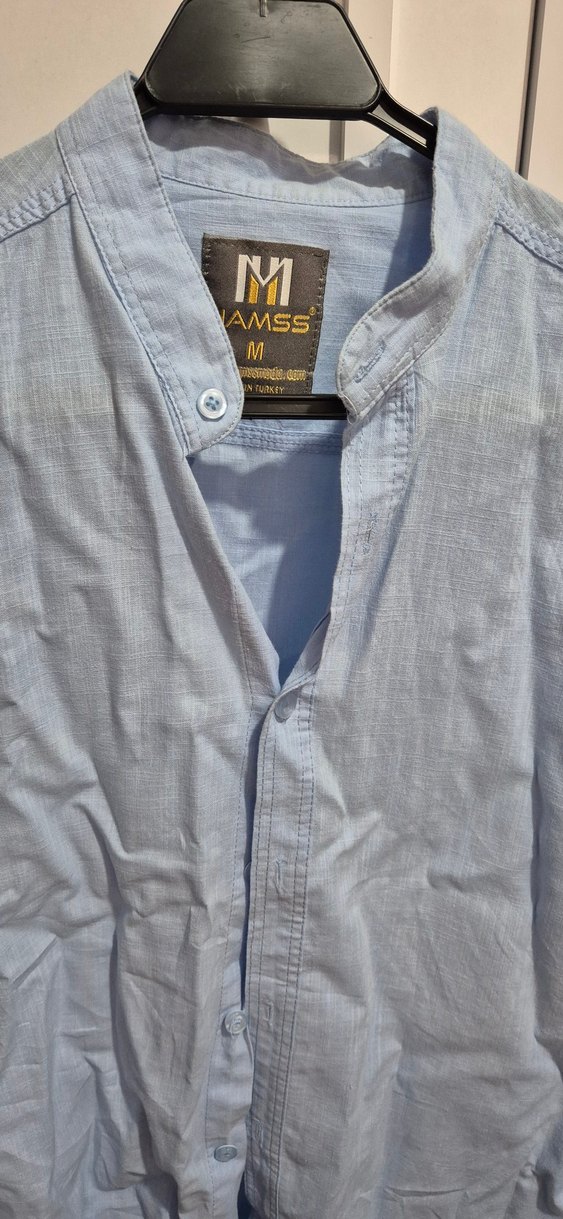 Düğmeli önü, V yakası ve kısa kollu erkek gömlek. Nefes alabilen keten kumaştan, gri renkte ve normal kesim. Günlük kullanım için uygundur. Marka: AMSS, beden: M.