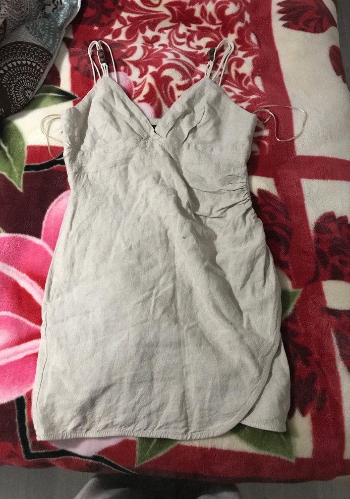 Gri keten kumaştan, V yakalı ve drapeli, fitted kesim midi elbise. Minimalist ve bohem tarzda, günlük kullanım için uygun.