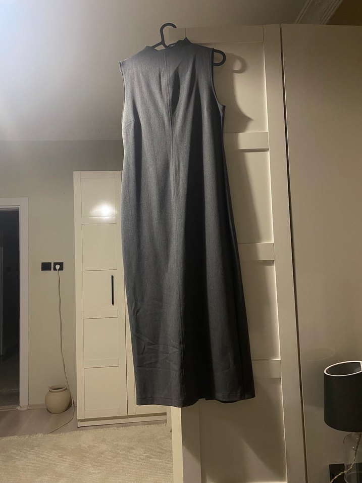 Gri Keten Yüksek Yakalı Uzun Elbise