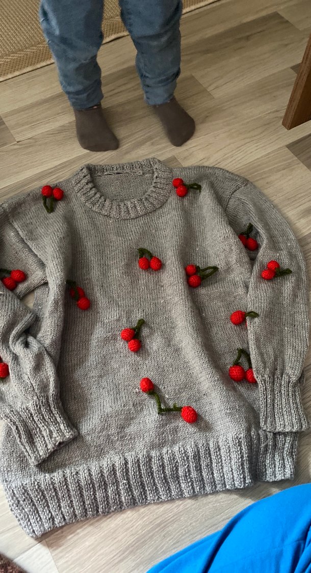 Gri renkte, kiraz nakışlı triko kadın kazak. Rahat kesimi, yuvarlak yaka ve uzun kolludur. Günlük kullanıma uygun, konforlu ve şık bir parça.