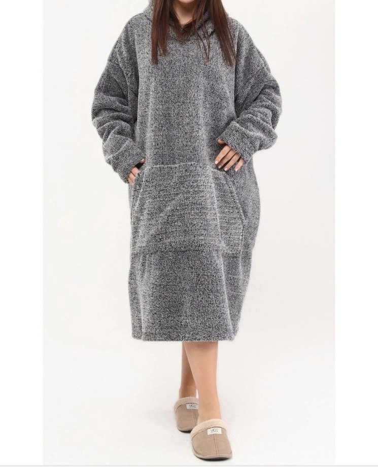 Gri kırçıllı kapüşonlu Rahat wellsoft oversize Kadın Ev Elbisesi