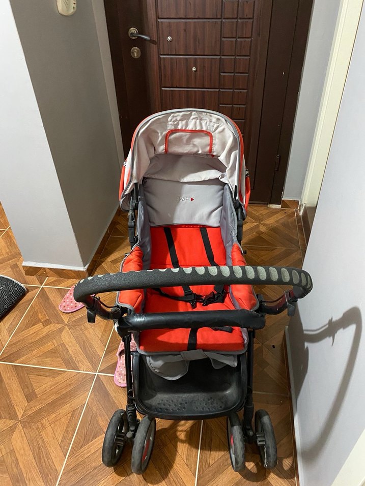 Gri ve kırmızı renkte, yastıklı oturma alanı ve ayarlanabilir tenteye sahip bebek arabası. Kolay hareket için sağlam tekerlekleri ve güvenlik kemeri bulunur.