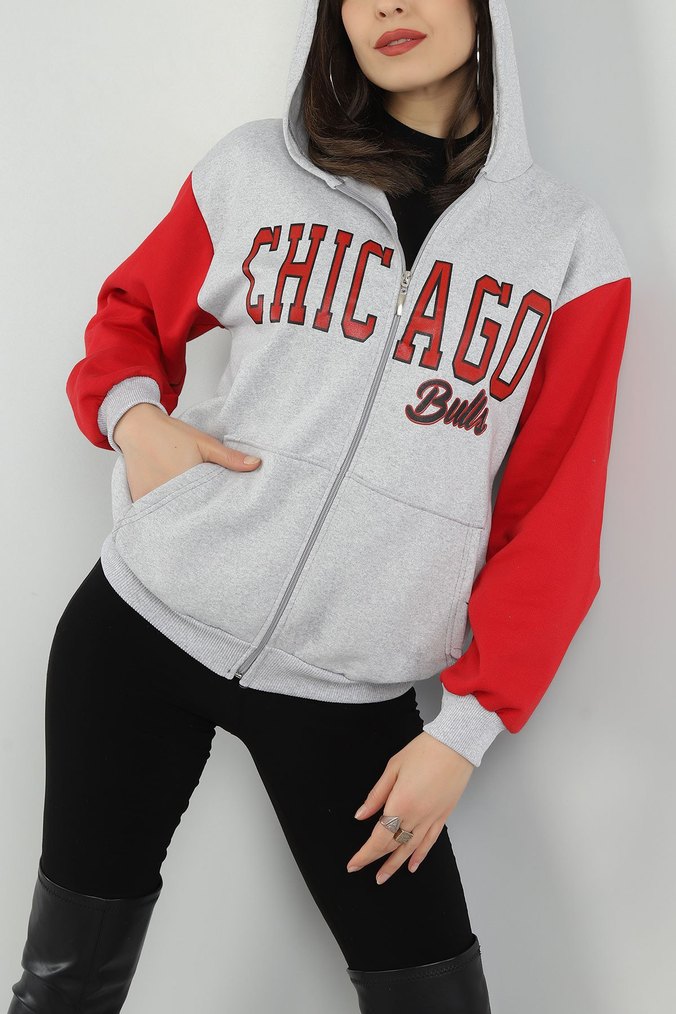 Gri Kırmızı Fermuarlı Chicago Bulls Sweatshirt