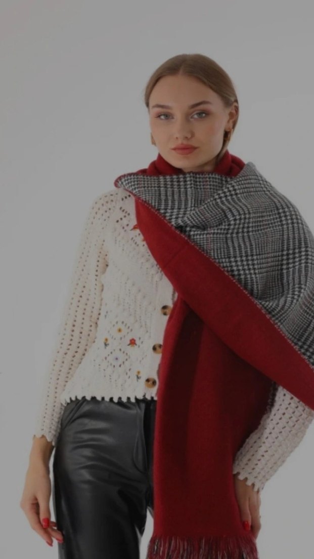 Kadınlar için gri ve kırmızı renklerde, örgü dokulu, rahat ve şık bir şal. Trend sokak giyimine uygun.