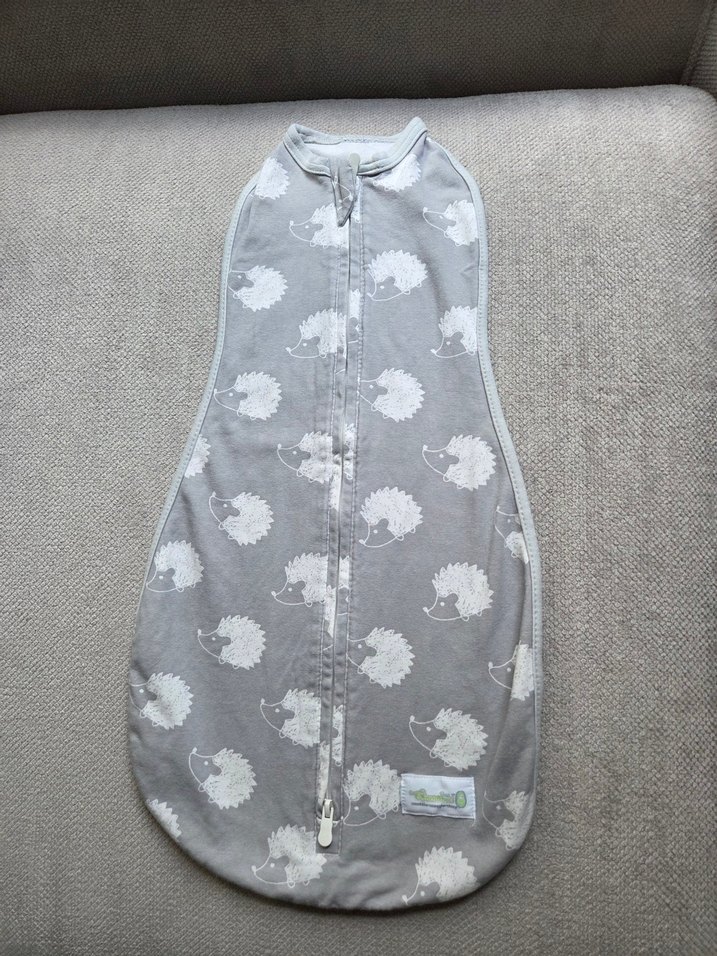 Gri renkli, yumuşak ve sıcak kumaştan yapılmış, kirpi desenli bebek uyku tulumu. Rahat uyku için idealdir.