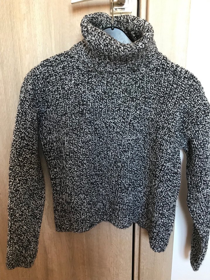 Gri renkli, balıkçı yaka ve uzun kollu, kısa kesim, ince dokuma kadın kazak.