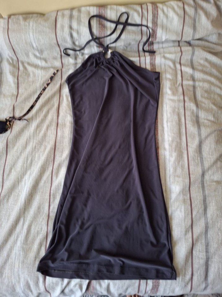 hem günlük hem şık gri vücuda oturan esnek kumaşlı elbise. ip kısımlarını enseye getirip bağlayınız. arka tarafta biraz sırt dekoltesi vardır.