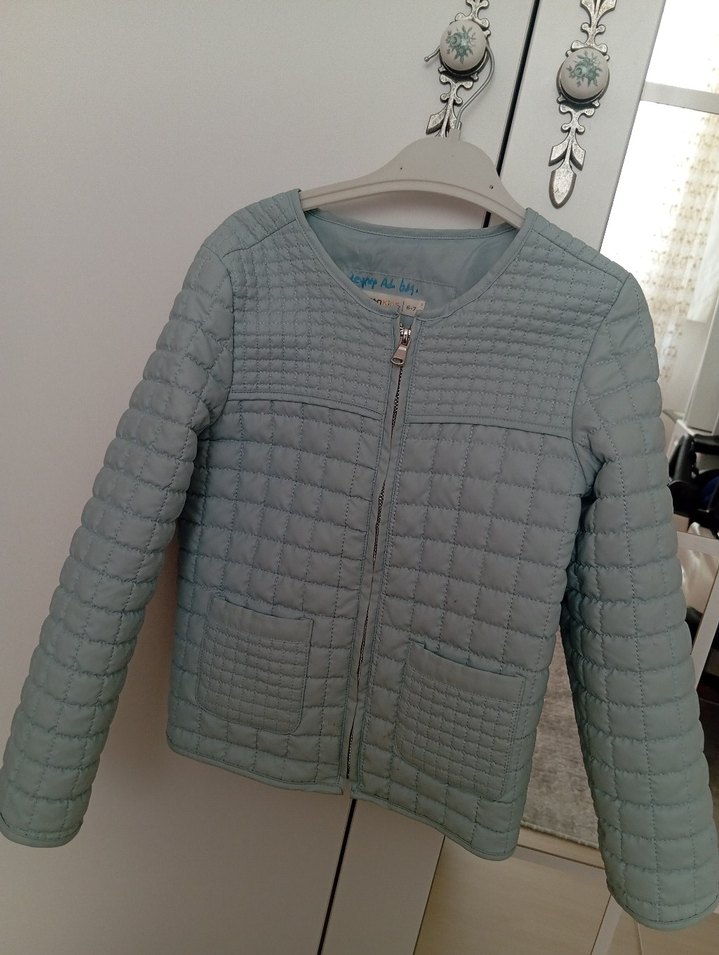 Gri renkli, kısa boy, düğmeli kadın ceketi. Uzun kollu, yuvarlak yaka ve rahat kesimlidir. Sentetik kumaştan, gündelik sokak stili için uygundur.