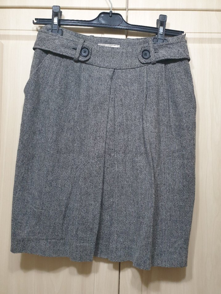 Gri renkte, kemerli, normal kesim ve yünlü kumaştan kısa cepli etek. Ofis kullanımı için uygundur.