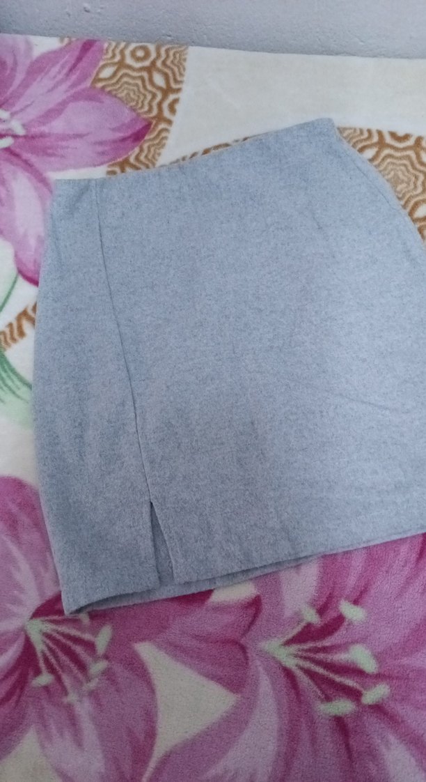 Gri renk, kısa mini hamile eteği, rahat kesim ve drapeli tasarıma sahip. Yumuşak ve sıcak kumaştan üretilmiştir, günlük kullanıma uygundur.