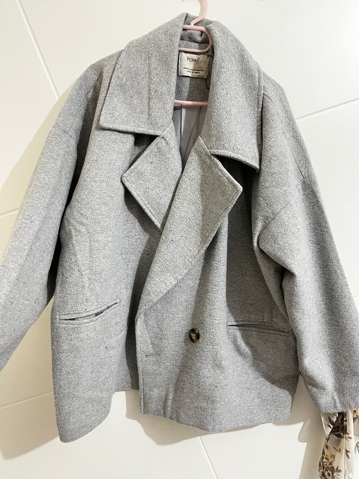 Geniş yakalı ve cep detaylı, yumuşak ve sıcak kumaştan yapılmış gri kısa kaban. Marka temsilidir standart beden