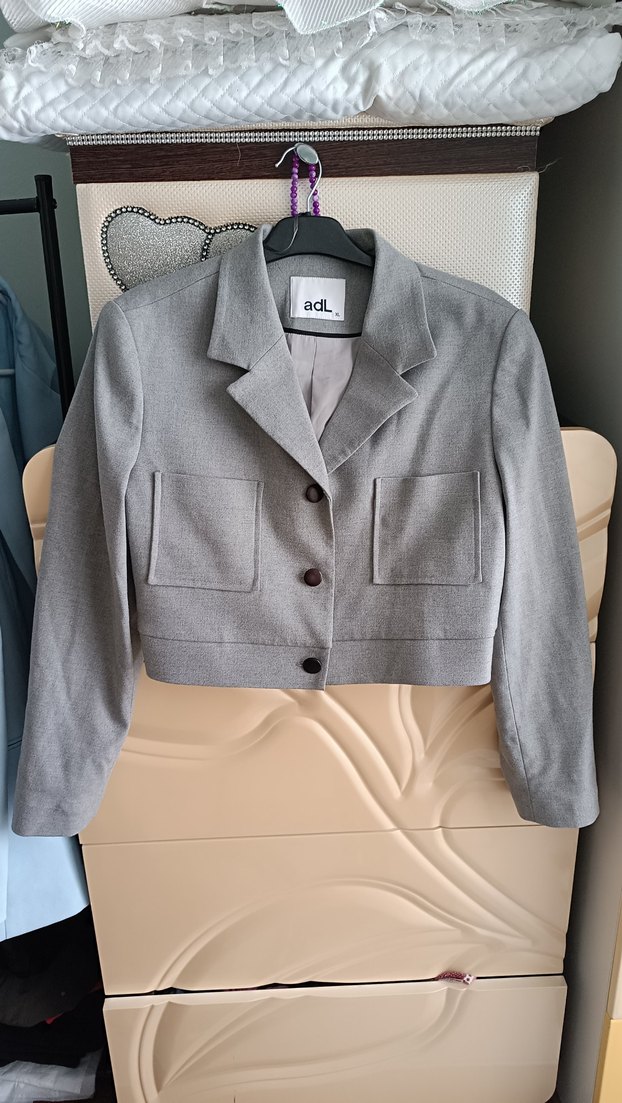 Gri renkli, kısa kesim, düğmeli blazer ceket. Notlu yaka, uzun kollu ve iki ön cepli, rahat kesim. Ofis ve günlük kullanım için uygundur.