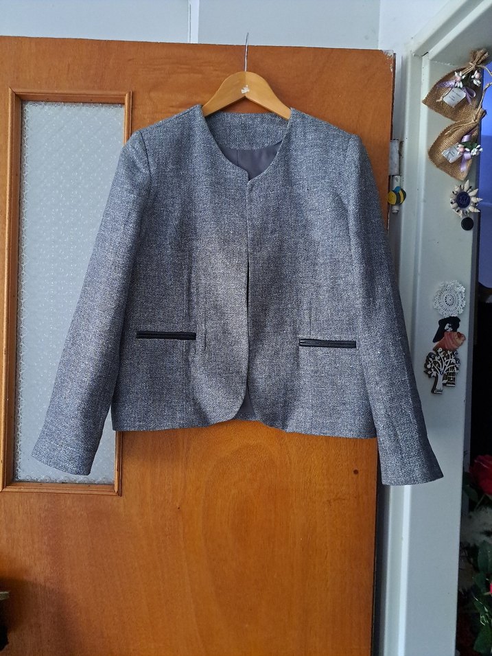 Gri KETEN kumaştan, kısa kesim ve kadın ceket. Uzun kollu, regular fit ve ofis için uygun modern tarzda. İki ön cep ve kesik yaka detaylı.