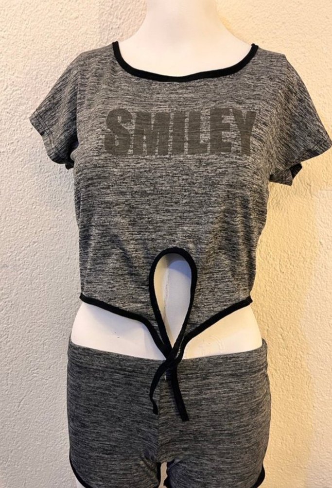 Gri kısa kollu, kruvaze yaka ve ön bağlamalı yırtmaç detaylı, "SMILEY" baskılı spor üst. Spor ve sokak tarzına uygun. ♀️XL beden ama L bedene daha uygun