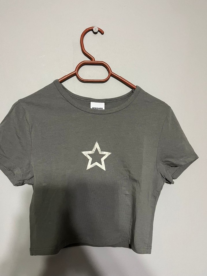 Gri renkli, kısa kollu ve baskılı yıldız desenli kadın tişörtü. Pamuklu ve rahat kesim, günlük kullanıma uygun şık ve sade bir parça.