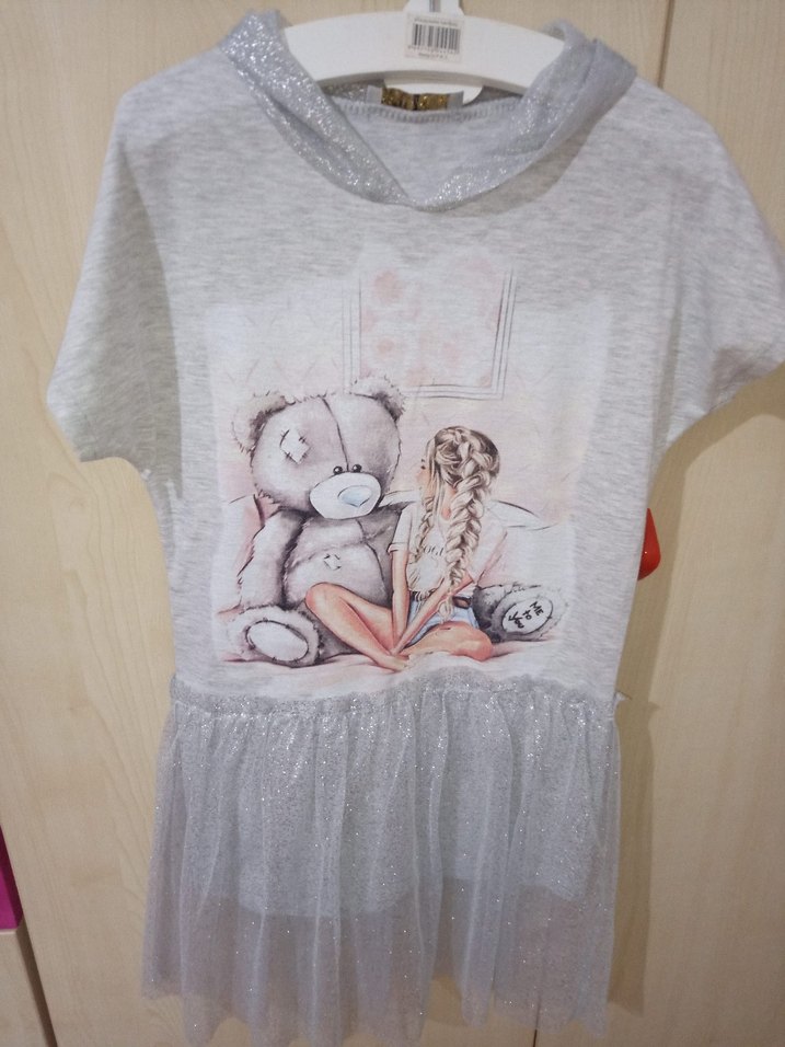 Gri renk kısa kollu, bisiklet yaka ve bol kesim elbise. Önünde baskı ve parlak triko etek ile sokak stili sunar. ✨