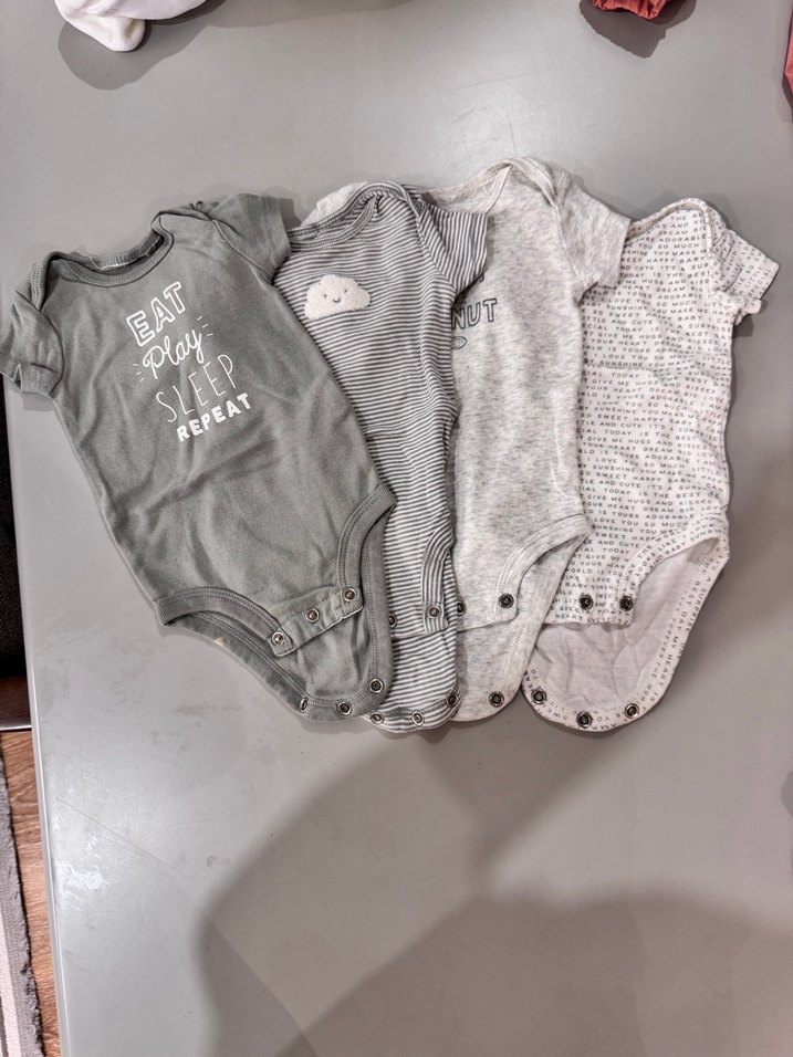 Yumuşak pamuktan, gri renkte, kısa kollu dört adet bebek body. Yuvarlak yaka ve düğmeli kapanışlı, desenleri farklı, sokak stili için uygun.