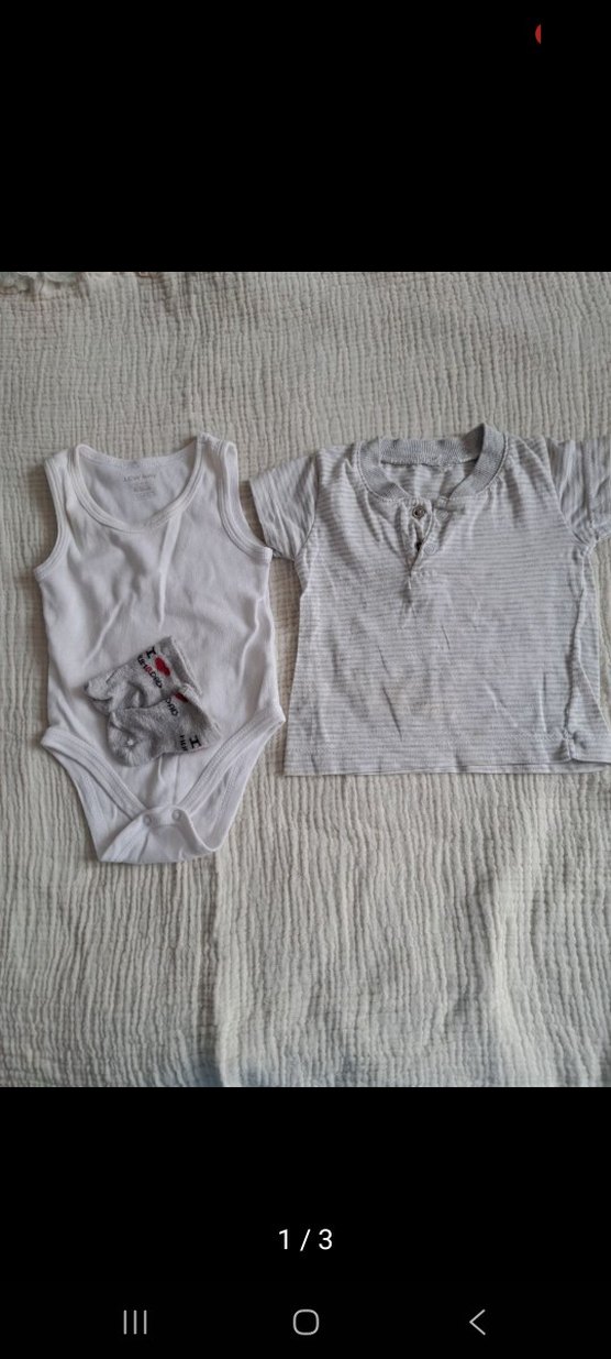 Pamuklu, gri renkte, kısa kollu ve bisiklet yakalı bebek body, rahat sokak stili için uygundur. 3-6 ay tşörtde lekeler var