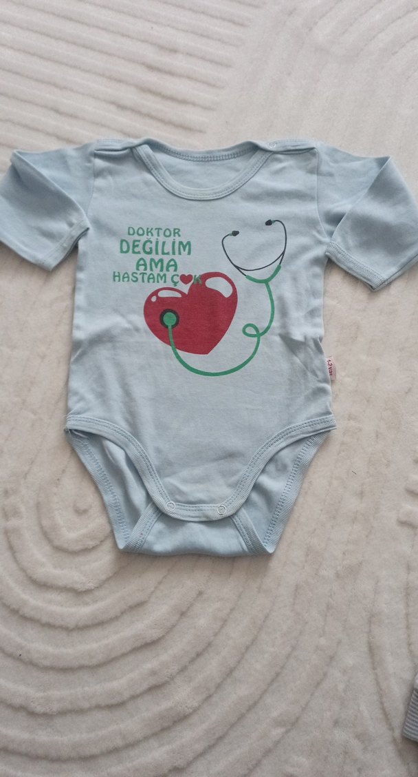 Yumuşak pamuklu, gri kısa kollu bebek body. Düğmeli, kalp ve stetoskop baskılı, "AMA DOKTOR DEGILIM HASTAMC" yazılı.