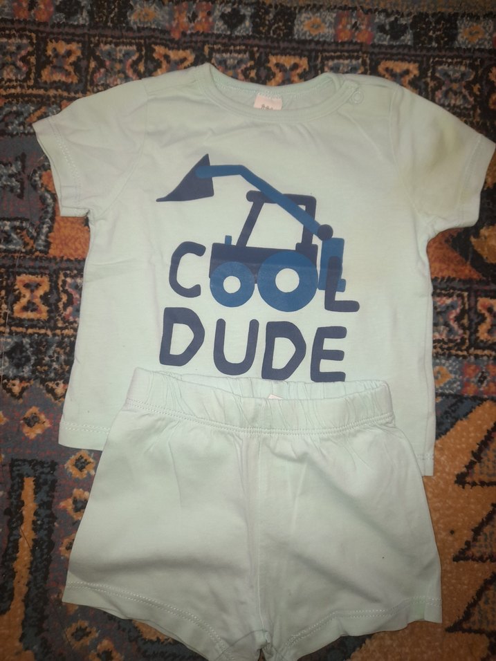 Pamuklu kumaştan yapılmış gri kısa kollu üstünde iş makinesi ve "COOL DUDE" baskısı bulunan, yanına uygun şortla tamamlanmış bebek erkek takımı. Rahat ve günlük kullanım için uygundur.