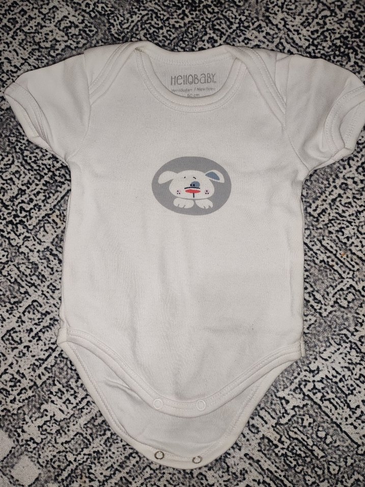 Gri renkli, kısa kollu, yuvarlak yaka, baskılı ve düğmeli bebek kız body.