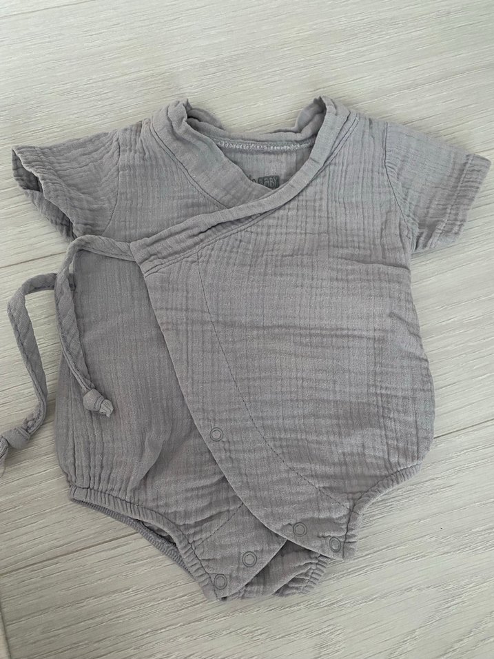 Gri müslin kumaştan, kısa kollu ve V yakalı bohem tarzda bebek body. Rahat ve şık bir görünüm sunar.