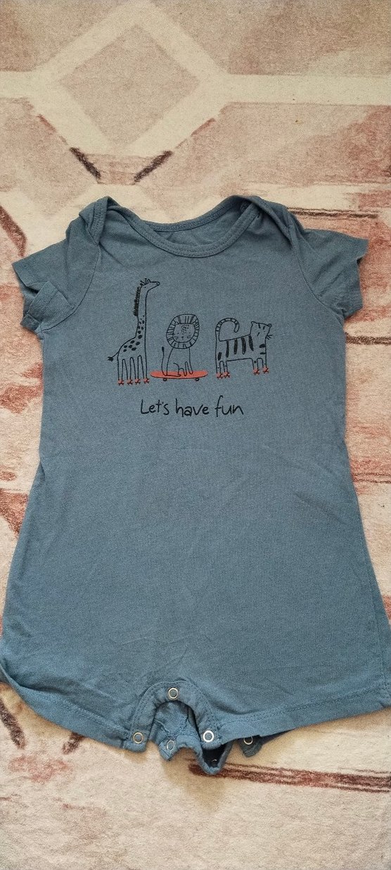 Gri renkli, kısa kollu, yumuşak denim kumaştan bebek tulumu. Önünde hayvan baskısı ve "Let's have fun" yazısı bulunur.