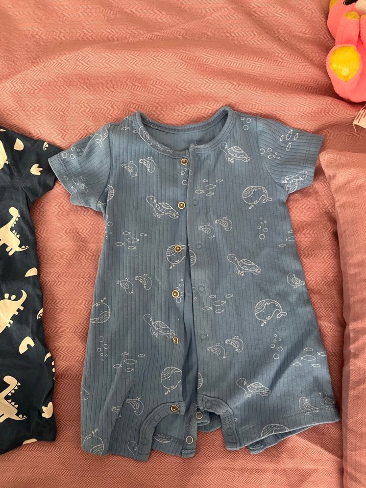 Gri renkte, kısa kollu ve boğazlı yakaya sahip bebek tulumu. Düğmeli, deniz temalı desenlerle süslenmiş yumuşak dokulu kumaştan yapılmıştır. 3 tanesinin fiyatıdır