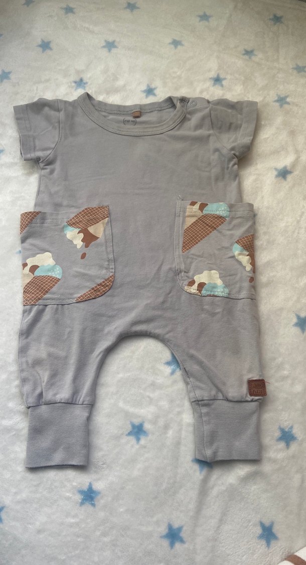 Gri renkte, kısa kollu ve yuvarlak yakalı, pamuklu bebek tulumu. Kemer detaylı ve dondurma desenli cepleri vardır, sokak stili için uygun.