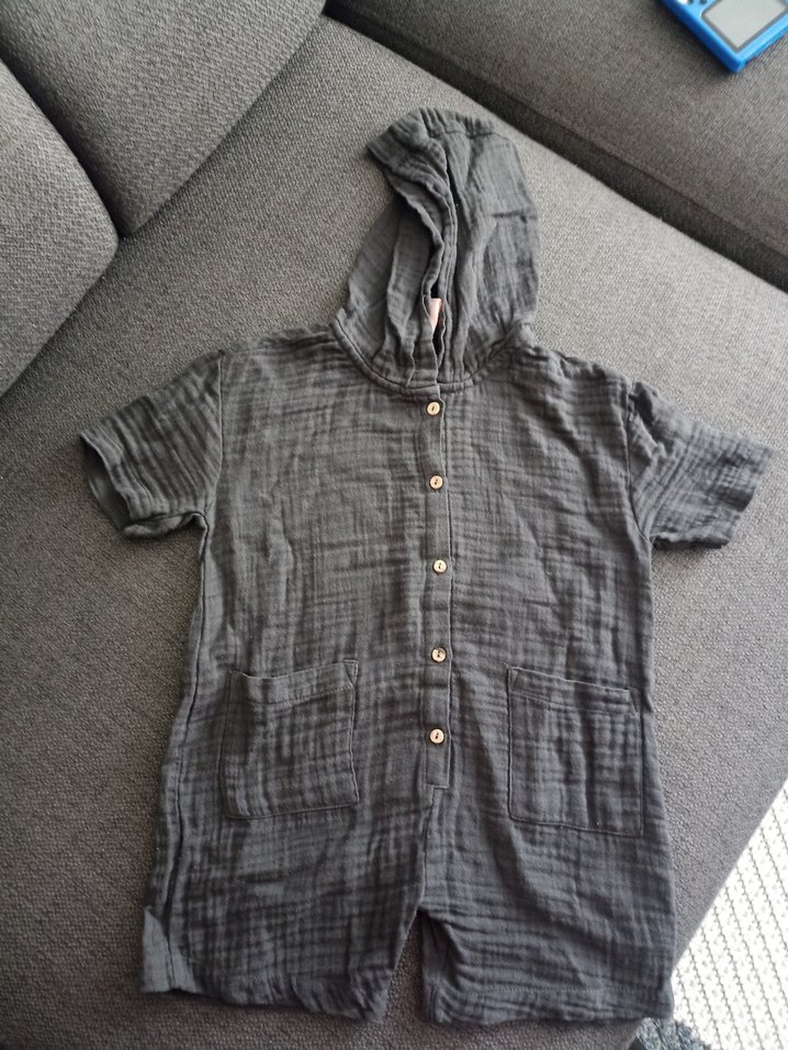Gri renkli kısa kollu bebek tulumu, düğmeli önde. Yumuşak keten kumaştan, kapüşonlu ve iki ön cepli, sokak modasına uygun. yeni ürün kullanılmamıştır
