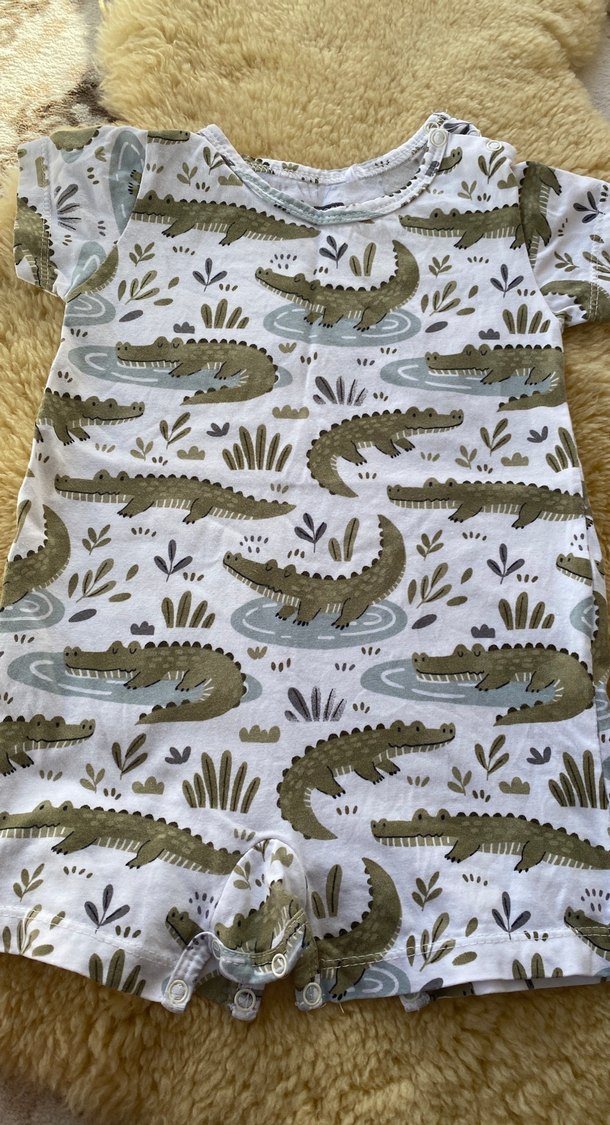 Gri renkli, kısa kollu ve tekne yaka bebek tulumu. Yumuşak sentetik kumaştan, bohem tarzda dantel detaylı ve sevimli timsah desenli.