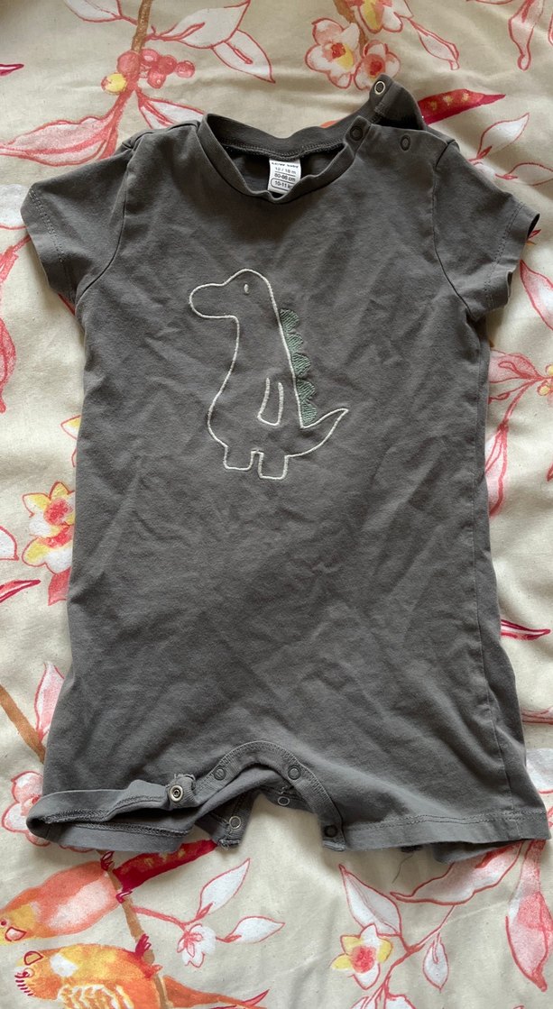 Gri kısa kollu, bisiklet yaka bebek tulumu, yumuşak keten kumaştan, dinazor baskılı, rahat sokak stili için uygun.