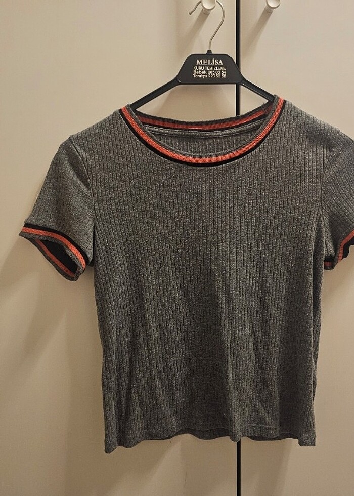 Gri renkli, pembe-siyah detaylı bluz. Small beden.