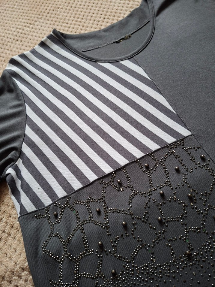 Gri renkli, yuvarlak yakalı ve kısa kollu Nakış ve pul işlemeleriyle detaylandırılmış, çizgili ve düz desenleri bir arada sunar. Günlük kullanıma uygundur.