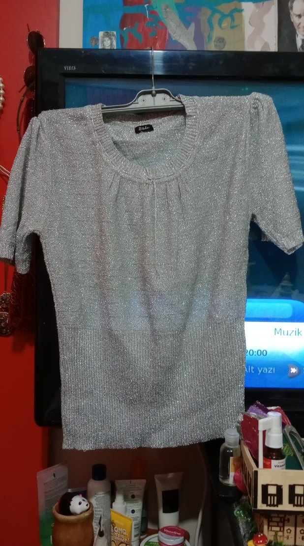 Gri Kısa Kollu Cıvıl cıvıl simli ışıltılı Kadın Triko Kazak