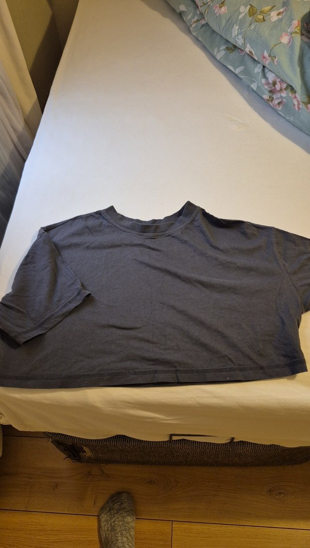 Yuvarlak yaka ve kısa kollu, bol kesim gri crop. Yumuşak pamuk kumaştan, günlük kullanıma uygun sade ve rahat bir model.