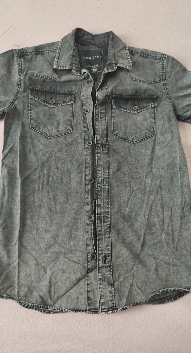 Gri denim erkek gömlek, düğmeli, kısa kollu ve bol kesimdir. Notlu yakaya ve iki göğüs cebi sahiptir, günlük sokak stili için uygundur.